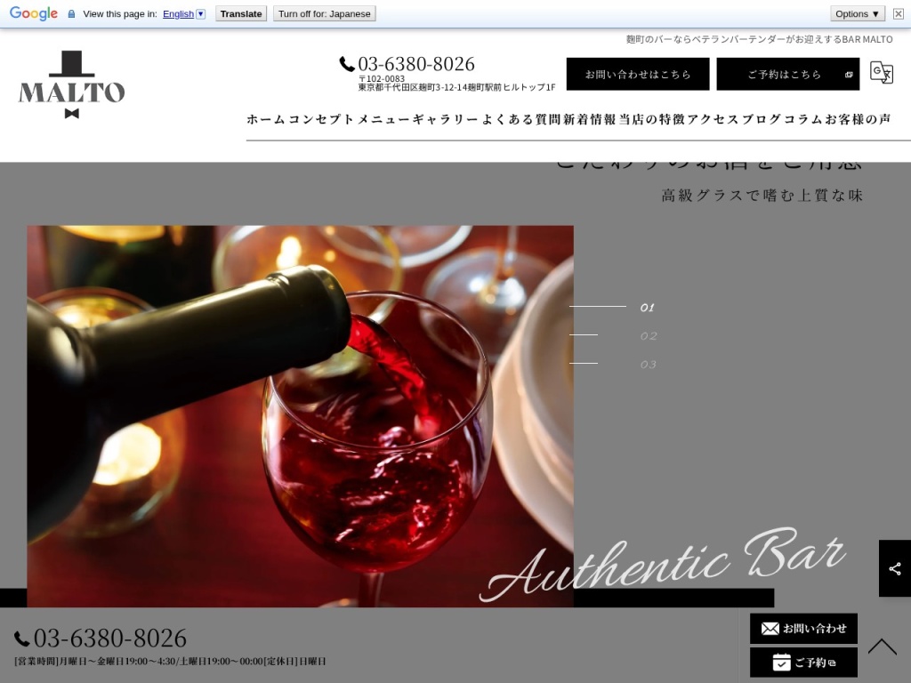 | 一人飲み | MALTO 麹町バー | 落ち着いた雰囲気、バーテンダーとの会話が楽しめる |